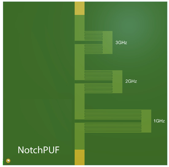 We would also like to point out that the NotchPUF does not need to be implemented on the top or bottom layers of the PCB, as we have done here. In fact, a better location would be to embed them in a buried layer within a multi-layer PCB. A buried implementation would increase the difficulty of physical tampering. Moreover, the widths of the notch filters’ wires, and overall size, would decrease because of their close proximity to adjacent ground planes.