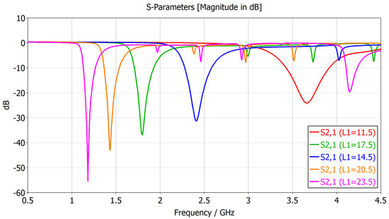 In CST Studio [31], a single double-resonator was modeled on a FR-4 substrate with a thickness of 1.6 mm. FR-4 is a low-cost printed circuit board material, manufactured from fiberglass cloth embedded within an epoxy resin. A full copper ground plane is placed on the entire bottom layer of the board with a 1 oz copper pour (1.4 mils). Using simulations, the length parameters L1, L2, S1, W2, and G1 (Figure 1) were tuned until the double interdigital resonator had a center frequency of 1 GHz. Once the optimal parameters for the 1 GHz structure were determined, only L1 was changed to get center frequencies of 2 and 3 GHz. Figure 3 illustrates the impact of using several different values of parameter L1 on the center frequency of the double microstrip resonator. From the plot, decreasing L1 causes the center frequency to increase. Moreover, because the other length parameters are held constant, and not simultaneously optimized in these simulation results, the fractional bandwidth (FBW) percentage also increases (filter gets wider).