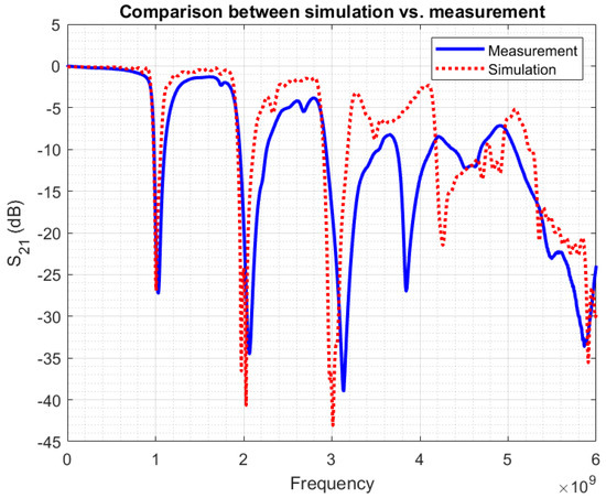 The simulation process that we used tuned all parameters simultaneously to achieve the optimal result, which yielded the following values: = 23.30 mm, = 14.50 mm, = 11.50 mm, = 8.35 mm, = 3.0 mm, = 3.0 mm, = 0.20 mm, = 1.0 mm, = 0.40 mm and = 0.15 mm. As noted earlier, only L1 is different in the 3 versions of the filter.