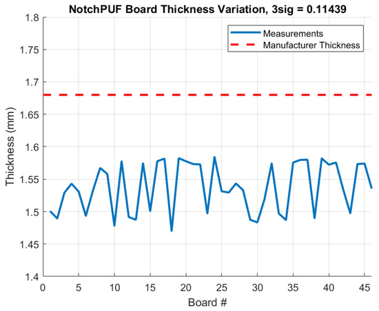 To quantify the amount of variation in the fabricated boards, 10 board thickness measurements were taken at each of the 3 locations on each of the NotchPUF boards as shown in Figure 5. The position indicated with an “X” was not used because a board label on the bottom-side of the board (not shown) adds to the thickness and would skew the results. The ground plane on the bottom-side of the board is added using a 1 oz copper layer process, which is nominally 1.4 mils in thickness. The manufacturer specifies the nominal thickness of the FR-4 substrate as 1.6 mm (or 63 mils). In addition to these two layers, the solder mask on each side of the PCB also adds to the thickness. Although not specified by the manufacturer, these layers are typically approximately 0.8 mils to the thickness. Therefore, the nominal thickness of the PCB is 1.68 mm (66 mils) when all layers are considered.