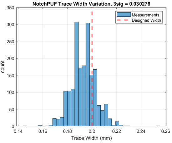 The distribution of trace widths obtained from these measurements are shown in Figure 7. As noted earlier in reference to W2 in Figure 2, the designed finger trace widths is 0.2 mm. The title bar indicates that the 3 variation of the trace widths is approximately 0.0302 mm. The average trace width (not shown) is 0.1930 mm, which is slightly smaller than the design width of 0.2 mm. These results show that the finger trace widths vary by approx. 15%, which are again within the manufacturing tolerance of 20%. This same amount of variation (0.03 mm) was observed on both lengths L3 and W1. From simulations, this variation was determined to have negligible effect on the NotchPUF response when compared to the finger width.