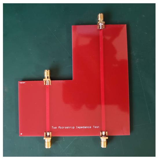 To determine the substrate relative dielectric variation, measurements were taken on a different set of 20 PCBs which included a specialized trace configuration. On this PCB, two 50- microstrip transmission lines are copper etched with lengths 50 mm and 100 mm, respectively. A photo of this board is shown in Figure 8. We use an Agilent 8753E vector network analyzer (VNA) to measure the difference between the electrical lengths of the two microstrips. The VNA applies a sequence of sine wave signals at specific frequencies to the input port and measures the response on the output port. The responses are then analyzed to derive the effective dielectric constant of the microstrip structure as a function of frequency using Equations (9)–(11). For a microstrip structure, part of the electric field is in air and a part is in the dielectric. If the dielectric constant of the material is , the effective dielectric constant must be less than , that is, between 1 and , because part of the electric field is in air and the dielectric constant of air is 1 [35].