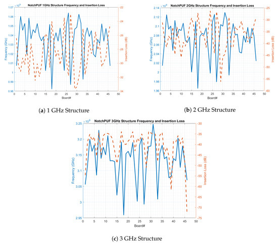 First, we report on the average frequency and insertion loss generated by each NotchPUF PCB. The rejection center frequency and the insertion loss are plotted as separate curves with one point for each of the 46 boards identified along the x-axis in Figure 10. The rejection frequencies for the PCBs varies above and below the target rejection frequency, for example, 1 GHz as shown on the y-axis in Figure 10a. The results of the NotchPUF measurements are summarized in Table 4 below. The average center rejection frequency for each filter represents approximately a 4.4% deviation from the target frequencies of 1, 2 and 3 GHz. The FBW 3 for each structure is 67.99 MHz, 94.73 MHz, and 187.75 MHz. The variations that occur in each of these response parameters are used to define a 15-bit identifier for each PCB as we discuss in the following.