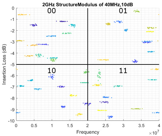 The variations that occur in the filters’ response are very large, which enables more than one bit to be obtained from the measurements. The data plotted in Figure 11 is reduced in amplitude over the original values by applying a modulus operation, which effectively wraps the values into a smaller region. The modulus operation accomplishes two goals. First, it translates the (x,y) points associated with each PCB into a fixed size region. In our example, the region is bounded by 0 to 40 MHz along the x-axis and −10 to 0 along the y-axis. The fixed size region in turn enables boundaries to be defined for the assignment of bit values, as shown by the four quadrants in the figure. Second, the modulus removes bias that occurs across PCBs but preserves the within-PCB variations, which improves randomness in the generated bitstrings.
