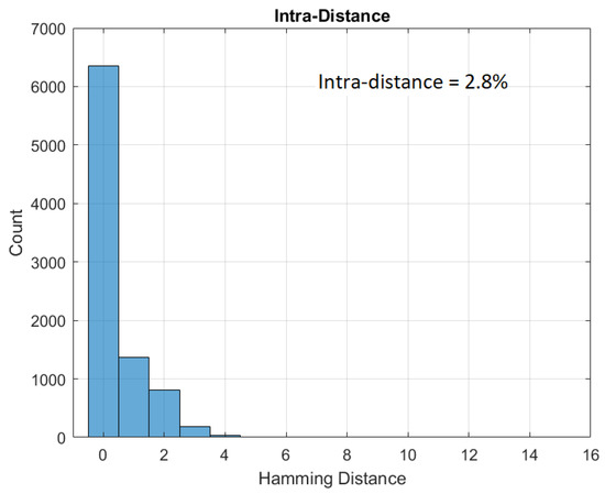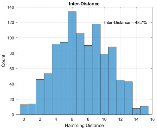 The uniqueness and reliability characteristics of the 15-bit bitstrings from the 46 boards were evaluated using inter-PCB and intra-PCB hamming distance (HD). The HD between two n-bit bitstrings x and y is defined as