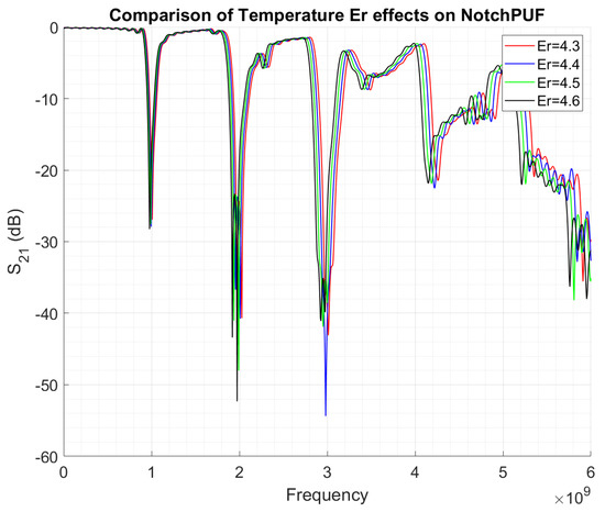 The experiments here were only performed at nominal temperature (25 °C). As ambient temperature increases, the FR-4 PCB dielectric constant increases approximately 4% from −30 °C to 105 °C [41]. This change in results in a corresponding linear change to the center rejection frequencies of the NotchPUF. Simulation results illustrating the temperature effect on are shown in Figure 14. The change in center frequency is proportional to the percentage change of the relative dielectric change (5%). For example, the value of is 4.3 at room temperature (25 °C) and is 4.6 at 105 °C. The shift in introduced by changes in temperature can be calibrated by offsetting the measured center frequency. However, this requires that the PCB have components capable of measuring the ambient temperature or that the PCB is able to store a set of reference “room temperature” values for each filter in a non-volatile memory.