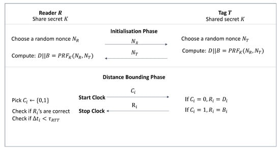 In general, a DB protocol consists of an initialisation and a rapid-bit exchange (a.k.a. distance-bounding) phase. In the initialisation phase, the reader and the tag exchange some public information, namely, public nonces, that will allow them to compute a common value using a preshared key. In the rapid-bit exchange phase, the reader sends a sequence of single-bit challenges to which the tag replies with single-bit responses. The distance of the tag to the reader is calculated by measuring the Round-Trip Time (RTT) of the challenge-response bits between the reader and the tag. If a DB protocol is derived from the original Brands-Chaum protocol [], then a last authentication phase is also needed for checking whether all protocol steps are followed correctly. But the Hancke-Kuhn protocol [] that we are going to look at next comprises only the initialisation and the distance-bounding phases.