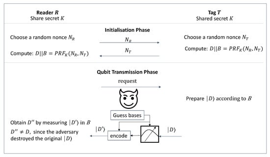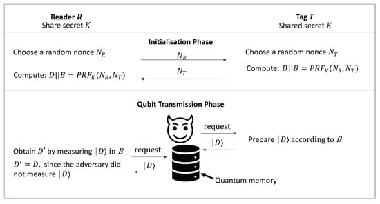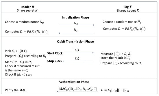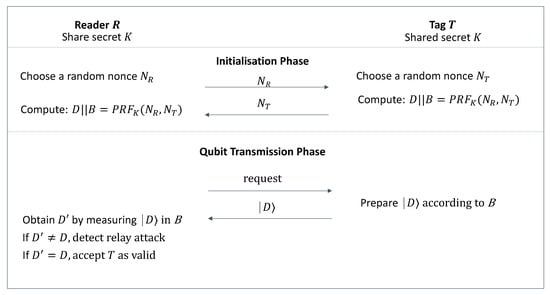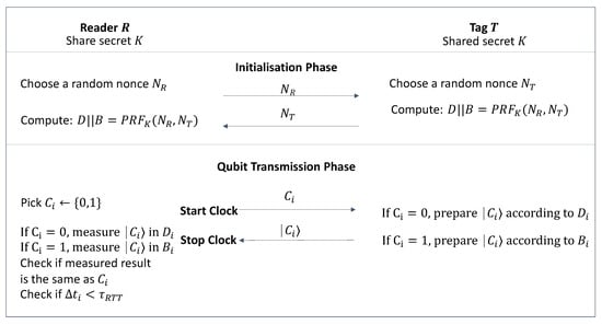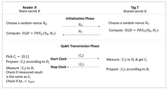 Figure 2 presents the RAD protocol from []. As shown in the figure, the protocol comprises two phases: an initialisation phase and a qubit transmission phase. The initialisation phase is the same as in the Hancke-Kuhn DB protocol presented in Figure 1. The qubit transmission phase replaces the distance-bounding phase of a DB protocol. In this phase, upon receiving a request from the reader, the tag prepares quantum states according to bases determined by B, and sends to the reader. The reader then measures the received photons in his copy of B, and checks whether the measurement results, say, , equal D. If , then the tag is accepted as valid; otherwise, it is regarded as relay attack detection.