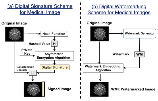 Figure 1 illustrates the previous two techniques to provide medical image transmission systems with a high level of security. In Figure 1a, a digital signature is generated by an asymmetric algorithm after signing a hashed value of the original medical image. The concatenation operator links the original medical image and the digital signature to generate a signed image. On the receiver side, the verification of the validity of the resulting signed image requires the corresponding public key to retrieve the received hashed value and compare it with the computed hashed value from the original medical image. The presented digital signature scheme deploys a hash function and asymmetric encryption. However, the asymmetric encryption algorithms are considered as computationally intensive techniques, relatively slow, and a certificate authority is required to manage the public keys [13].