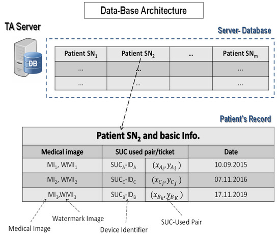 Figure 8 illustrates the TA DB structure that stores patient records. Each patient record contains patient’s medical images, and some information about their watermarked images.