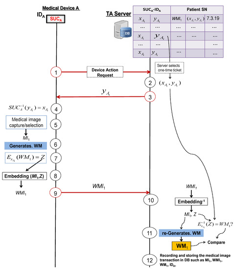 Figure 8 shows an example about a patient’s record consisting of the basic information of the patient, the patient’s watermarked images, medical devices IDs and the used tickets for signing watermarks, and the data. Note that the clone-resistant watermarked image is transmitted and stored in TA DB. Therefore, each user/doctor should send a request to the TA server to get a patient’s medical image. In this proposed system architecture, the user/doctor cannot communicate directly with the medical device. The communication is only done through the TA server and the communication with the TA server is performed over insecure channels.