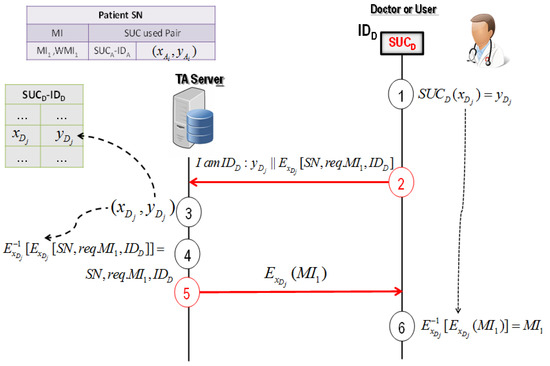 The proposed MIS allows a doctor/user to receive securely a medical image through a TA server. The doctor does not communicate directly with a medical image generator. Here, the TA server plays a mediator role in the proposed system. In Figure 7, the proposed system architecture comprises three main components: First, the TA server hosts a secure database (DB). Second, the medical device as an example of the clone-resistant medical generator A. Third: A doctor D as an eligible user with an embedded SUC in his or her own device such as a computer or mobile/token.