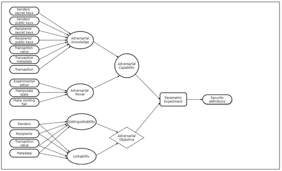 In the context of cryptocurrencies, adversarial capabilities depend on a number of factors, which collectively results in a series of unique attacker scenarios. The adversary’s knowledge of public/secret keys of senders and recipients, value and metadata of a given transaction, and other transaction data correspond to adversarial knowledge. The ability to setup the initial state, to manipulate the state, and to cause minting to fail are the variables corresponding to adversarial power. Further, the adversarial objective can also be manifold, and we consider indistinguishability and unlinkability with respect to anonymity of senders, recipients, transactions etc. (we discuss these notions in detail in subsequent sections). Each adversarial goal, when combined with different capabilities, results in a large number of attacker scenarios. We construct a single parametric experiment to capture all possible adversarial capabilities, with each parameter combination resulting in a distinct security definition. This conceptualization is illustrated in Figure 1.