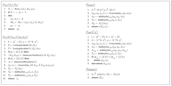 We define a group of oracle functions to provide the adversary with access to honest functionality during the execution of the game (Figure 2). These include for creating addresses, for creating hidden addresses, for creating transactions, and for minting. Another oracle is defined to generate hidden metadata (). The history of the activities of the oracles are maintained globally within the games, i.e., as associative arrays and as a set to store all addresses, transactions, and minting history, respectively. In addition, , and are maintained as sets to store hidden addresses, transactions, and metadata, whereas stores the randomness of the coins spent in transactions. In order to cater for the addresses created with different adversarial inputs, the oracle keeps track of different groups of addresses in with binary values j and k, and a value of 0 representing adversarial identity and adversarial randomness, respectively. sets the flag globally, if a minting operation fails, in which case the adversary loses the game, unless = 1. The adversary has access to all available oracles, unless specifically mentioned with a specific subscript in the games. Table 6 summarizes the variables used by the oracles.