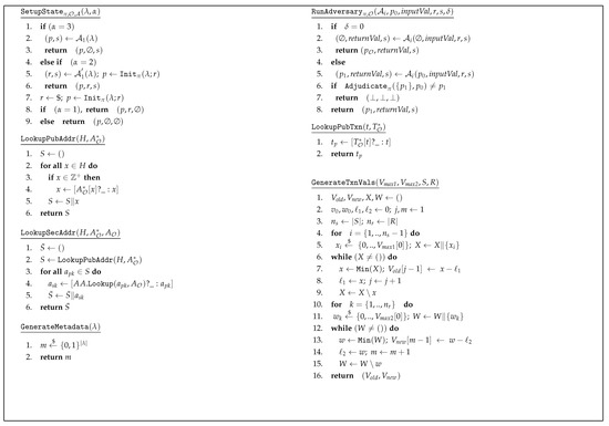 Additionally, we also define a set of helper functions to be used in the security games as given in Figure 3 to improve the clarity of the games. The function performs the state initialization based on INIT, whereas the function executes an instance of the adversary denoted by different subscripts based on ACT. and functions are used to obtain public keys and private keys from hidden addresses, respectively. In addition, outputs the corresponding to a hidden transaction when . function is used when , to generate required input and output transaction values, based on the the maximum transaction value given by the adversary. Further, function generates metadata values required for a transaction when while is used to obtain hidden metadata when .