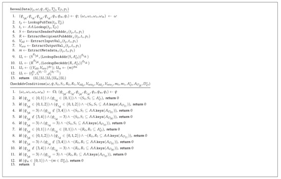 Table 3 summarizes the structure of the algorithms of the scheme. The initial setup of the scheme is defined by the algorithm in terms of a security parameter , and this process generates the genesis state. The payment address creation process, , takes an identity and some randomness, and generates a public–private key pair () and a transaction, which can be minted to register the addresses. Public and private keys can be validated with respect to a given state, p. A transaction is created with unspent funds from one or more senders () and corresponding funds for recipients (), together with transaction related metadata m such as corresponding IP addresses or other system-specific data. The validity of a transaction can be defined with respect to its public part as well as both public and private parts taken together. The difference between the total input value and the total output value is considered as transaction fees. Further, transaction-related data (input–output values and public keys of senders and recipients) can be extracted from a given transaction, if both public and private parts of the transaction are known.