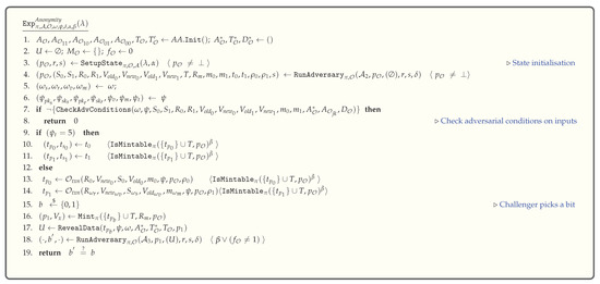 All other operations in are of the form . In this case, with the modified operation, if the adversary knows the transaction, then the public keys can be known and details about senders could be obtained. When a bit b is chosen, the adversary simulates and if , the adversary is able to obtain additional information about the senders and therefore it is not secure. Accordingly, this scheme is secure in , but not necessarily secure in , i.e., .