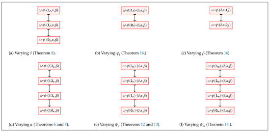 represents the strongest adversary with the capability to manipulate the state whereas the adversary is only able to view the state when , thus representing a weaker adversary. Similarly with , the state is private and hence the adversary is the weakest in this respect, being unable to view the state. Using the same proof technique as in Theorem 6, we can see that represents a more powerful attacker than and also is more powerful than , thus it is clear that both implications are true. □