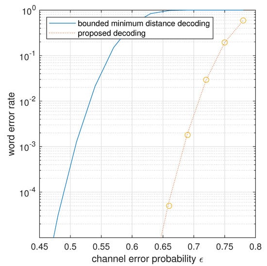 In this section, we present results for the decoding beyond half the minimum distance. We present numerical results for the one Mannheim error channel. The one Mannheim error channel was introduced in [] as an approximation to the additive white Gaussian noise channel. The numerical results demonstrate that the proposed decoding can correct many error patterns where the number of errors exceeds . We show that the work factor for information-set decoding can be increased by exploiting this decoding beyond half the minimum distance.