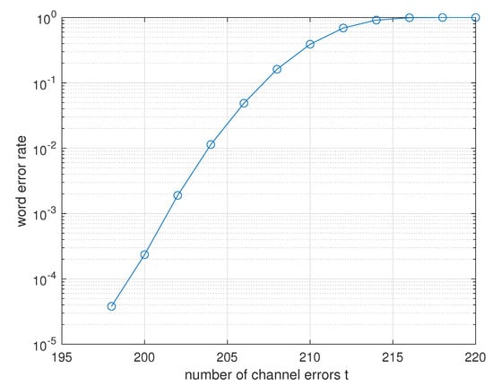 In Section 3 we have shown that the proposed decoding algorithm is not limited to bounded minimum distance decoding. Hence, it is possible to increase the number of errors and the work factor by allowing a certain failure probability for the decryption. Such a failure probability is inherent in all McEliece systems that decode beyond the guaranteed error correction capability of the code, for example, systems based on LDPC codes [,,,]. However, there is an important difference with the proposed coding scheme. A decoding error with LDPC codes results typically in an erroneous message. The proposed decoding approach can fail, when the number of errors exceeds the error-correcting capability . Yet such a failure can always be detected since it implies that the number of erasures for the outer code exceeds and the number of erasures is known after the inner decoding stage.