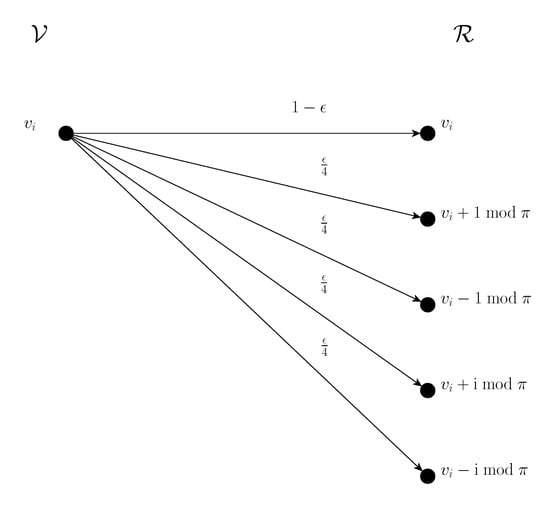The one Mannheim error channel is a discrete memory-less channel which can be characterized by a transition matrix that contains all transmission probabilities from an input symbol to the channel output (see Figure 3). For the one Mannheim error channel, we have . Errors (non-zero values ) occur independently with probability , where all error symbols are equally likely, that is,