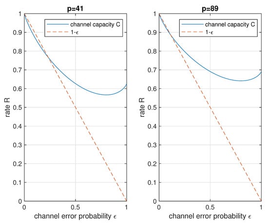 Channel capacity for the one Mannheim error channel for p = 41 and p = 89.