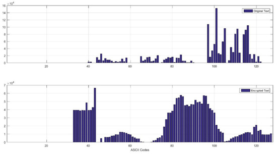 In cryptanalysis, frequency analysis is the study of the frequency of letters or symbols in ciphertext. The frequency can be represented in a histogram [43]. An attacker can use frequency analysis to obtain the key or the plaintext. This type of attack is called a statistical attack. To prevent such attacks, the plaintext and ciphertext histograms should not be statistically similar. Therefore, the ciphertext histogram should be relatively uniform. The generated histograms of the plaintext and its corresponding ciphertext are shown in Figure 3. It can be seen that the histogram of the encrypted text is quite uniformly distributed and differs significantly from that of the plaintext.