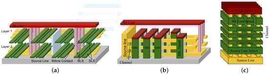 (a) 3D NAND stacked architecture [], (b) 3D NAND vertical gate (3dVG) architecture [], and (c) 3D NAND BiCS architecture [].