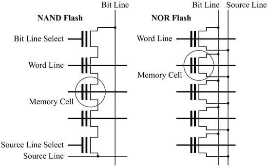 Figure 2 (left) illustrates the basic structure of planar (two-dimensional) NAND flash memory, which gets its name from its visual appearance. It is organized in strings of cells connected in series and these strings resemble the pull-down network of a NAND gate. A combination of lines driven high or low allow for reading, writing, and erasing operations. Each string has a bit line select transistor on one end that connects to a bit line, and a source line select transistor on the other that connects to a source line. Cells store data in floating gate transistors through electron tunneling, and all cells connected to a given word line comprise a page within a block. All cells in a page are operated on together and typically allow for 512 bytes + 16 spare bytes, 2048 bytes + 64 spare bytes, or 4096 bytes + 128 spare bytes of storage in the page []. A memory block often contains either 32 or 64 pages. The configuration results in slow reading times relative to NOR flash (NOR flash will be described in Section 3.2), as entire pages must be read at once to access sequential data. On the other hand, it does allow for faster writing and erasing cycles. The series configuration of cells in the NAND architecture also allows for higher storage capacity than a NOR architecture of similar size, which is an attractive quality for space-constrained electronics. The bulk read and write operations offered by NAND flash make it useful in a wide range of storage applications that involve sequential data archiving, such as audio and video storage. NAND flash is commonly used in storage devices such as SSDs (solid-state drives) for secondary storage in computers, USB flash drives, and SD (secure digital) cards for portable devices such as digital cameras. NAND flash memory is generally cheaper than NOR flash.