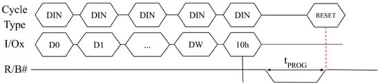 Impact: This process variation extraction method has been used for a wide variety of characterizations, ranging from quantifying radiation damage to unique signature generation. Program/erase interrupt is visualized in Figure 5. Here, the data line “DX” is writing data to a flash block. The Cycle Type line is used to visualize what commands are being used to write or program these data to the flash block. As the “10 h” program command is sent to the flash module, a “RESET” command can be sent while the programming is taking place. This programming can be interrupted, leaving flash cells in an intermediate and sensitive state []. To measure this interruption, the R/B register, also known as the ready/busy register, will go low as the operation is being performed. However, when the operation is interrupted, it will return to high as the command is interrupted and the device has completed the programming and is in the ready state. This can allow for a speed-up of signature and random number generation by putting flash cells into intermediate unsteady states that are extremely sensitive. It can also be used to provide tunability to specific hardware security primitives. For example, Wang, et al. [] used partial programming to tune their PUF construction to allow for variable generation and robustness.