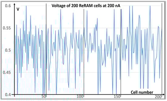 Pristine ReRAM cells have extremely high resistance values, typically higher than 100 MΩ [43,44,45]. In the pre-forming range, the injection of very small currents, between 1 nA and 1µA, forces the resistance values of the cells to drop to the 0.1 MΩ to the 20 MΩ range; after current injection, the resistance values return to their original high resistance values of the pristine state around 100 MΩ. The conduction is thereby ephemeral and reversible. The electrical resistance is defined as the ratio of voltage to the electric current. The pre-formed resistance of each ReRAM cell is unique to that cell and depends on their location in the array, and the physical properties that vary due to the variable defect density observed in the active areas of the cells, along with variations in thickness between metallic electrodes. Millions of pre-formed ReRAM cells were characterized at various levels of currents. Their stochasticity is extremely high, as reported in the example of Figure 1, in which the voltage drops across 200 consecutive cells are measured at the current of 200 nA.