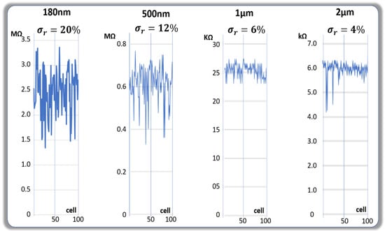 One of the figures of merit related to the randomness is the standard variation of the parameter, voltage drop or resistance, measured at a constant current injection divided by the median value of the parameter. Such a relative standard deviation is respectively 20% for the cell population at 180 nm, 12% at 500 nm, 6% at 1 µm, and 4% at 2 µm. These variations in randomness can be explained by models based on the density of random defects. Let us assume the following: