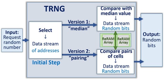 The PRNGs are widely documented, and available, often they rely on mathematical methods [1,2,3,4]. Some PRNGs do not offer enough protection against sophisticated opponents, therefore additional methods to enhance randomness are needed such as the ones based on chaos, and TRNGs [5,6]. The algorithms for PRNGs are often known, so opponents can independently generate long random numbers, and compare them to the ones generated by the PRNGs. Relatively simple matching algorithms can then be used by the adversary to understand the use of the PRNG. In 2018, an article from the National Security Agency (NSA) stated that “the use of PRNGs can result in little to no security; the generation of quality random numbers is difficult” [7]. Conversely, some authors suspect that perhaps backdoors are inserted in commercial PRNGs by governmental institutions such as NSA [8]. TRNGs rely on the natural randomness of physical elements with high levels of stochasticity [9,10]. Considering that the sources of physical randomness are often mixed with sources of more deterministic parameters showing the “DNA” of the physical elements, it is desirable to mix several sources of randomness together, including the ones generated by mathematical algorithms [11]. For example, the source of randomness can be due to both the variations in time of the physical parameters, as well as the noise and uncertainty due to the measurement of these parameters [12]. The design of TRNGs is difficult, problems such as the elimination of oscillations that can be attacked through Fourier transform, need to be addressed. Randomness can be enhanced by combining the streams generated by unrelated physical elements, and by mixing TRNGs with PRNGs. The other types of attacks that are effective include the injection of noise in the TRNG schemes, which can replace the random numbers by data streams known by the opponents. Remedies include the design of TRNGs that can operate at extremely low power, below the noise level, making most noise injection schemes difficult to master and hide. The randomness is quantified by using tests suited for random number generators such as the one described in the NIST publication 800-22 revision 1a [13]. In the case of TRNGs using randomness enhancement schemes, it is recommended to test the data streams a first time after generation from the physical elements, then a second time after final operation. ISO/IEC 20543:2019, within ISO/IEC 19790 and ISO/IEC 15408, is an example of a document specifying a methodology for the evaluation of multi-step non-deterministic or deterministic random bit generators intended to be used for cryptographic applications [14]. Both NIST and ISO documents are implementation-agnostic, they do not offer specific guidance to designing PRNGs or TRNGs, however “passing” such test suites is usually mandatory for commercial use. In this work, several implementations of ReRAM-based TRNGs are analyzed with the methodology recommended by NIST.