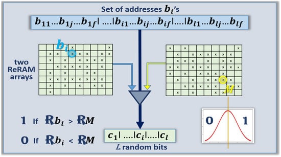To generate N random bits, l addresses of cells in the ReRAM array are needed, with l > N. Assuming that f bits are needed for each address, a stream of f × l bits is needed for the median scheme. For example, if the size of the array is 1,048,576 = 220, then f = 20. A stream longer than N is needed for the protocol to handle the defective cells. The median value M of the resistance values of the entire cell population is also known, as well as some addresses in one array that have values close to the median. The example of Figure 4 shows the implementation with two separate ReRAM arrays, one to find each cell, a second one to find a cell with median value, and an analog circuit comparing the resistance value of the two cells at a given current.