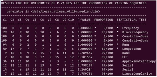 Median scheme: The random numbers generated with the median scheme presented in Section 4.4 failed six out of twelve NIST tests, largely due to the imbalance between “0”s and “1”s. The additional XORing operation was handled in the following way: