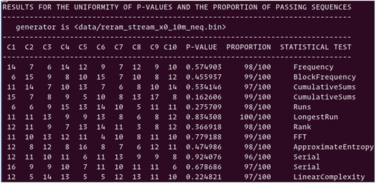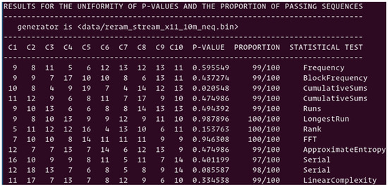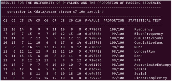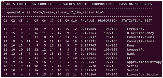 Pairing scheme: The first stream of random numbers generated with the pairing scheme, and analyzed in Section 4.4, fails three out of twelve NIST tests due to the presence of pairs having the same resistance value. The sequence presented above with the XORing by chunks of 7 bits was applied to the resulting random numbers. As is shown in Figure 13, all NIST tests are passing, and the average score is 98.75%. The three tests failing in Section 4.4, are now passing with the score of 100%. While the data stream generated without eliminating the pairs with identical resistance values is failing the frequency test due to the imbalance between “0”s and “1”s, the XORing operation seems to be a simple way to mitigate the problem.