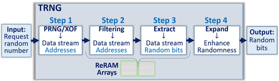The randomness of the physical parameters that are exploited for the design of TRNGs, such as the cell-to-cell microscopic variations created during fabrication, can be also used to design physical unclonable functions (PUFs) that generate cryptographic keys from Challenge and Response Pairs [30]. Examples of memory-based PUFs were studied in prior work [31,32,33,34,35]. However, with TRNGs, the random numbers generated at each request should be totally different from the previous ones, while the PUFs should always generate the same keys from the same challenge. The reliability of the PUFs are validated by generating the same keys multiple times, and verifying that they are consistently identical. In both cases, TRNGs or PUFs, the data streams generated as either random numbers or keys should pass the test of randomness presented by NIST and ISO [13,14]. The levels of randomness of a memory-based PUF can be validated by generating long data streams, in the multi-megabits range consisting of multiple 256-bit long keys generated from the same PUF. The industrial firm Intrinsic-ID, a provider of SRAM-based PUFs for the Internet of Things, has proposed an implementation of TRNGs that exploit the same PUFs [36]. The source of randomness of the SRAM arrays, which is available by powering up the devices, generates seeds that have enough entropy to be used for the generation of random numbers. The cells of SRAM devices are flip-flops that can switch to a “0” or a “1”state after power off-on cycles. Due to the microscopic variations, certain cells always switch back to the same state, others are highly unstable, which is desirable for the design of TRNGs. Two measurements of the same PUF are always slightly different. In order to be applicable for the design of reliable TRNGs, a sufficient number of bits should change between measurements in an unpredictable way. We independently conducted experimental work to validate such a method with commercially available SRAMs, and confirmed that between 3% and 5% of the array are highly unstable, and are therefore usable for the TRNG. Methods to enhance the randomness of the streams generated by SRAM-PUFs have been proposed [36,37,38]. One way to design both a TRNG and a PUF from the same memory array is to use a ternary mapping of the arrays, segmenting the cell population between the predictable cells that generate reliable “0” or “1” states, and the cells that are unstable and marked with the ternary state “X”. As described in prior work, the TRNGs are designed by using the unstable cells, while the key generating PUFs are designed with the predictable cells [39,40]. The addresses of the unstable cells, representing 1–3% of the entire population, are stored in a look-up table, and are tested to generate the stream of random numbers. Every time they are tested, the stream is different. Additional steps are needed to enhance the randomness of streams generated by such methods as described in previous publications, in which blocks of random bits are XORed together, i.e., addition mod 2 [41,42]. A statistical model of such an XOR operation is that presented to optimize the size of these blocks to reach a certain level of randomness. One of the constraints of this method is the repetitive use of the same cell population, which could slow down the process for large data streams. In contrast, the schemes presented in this paper can use most cells of pre-formed ReRAM arrays, typically 75% of the total population, for the quick generation of larger streams of random numbers. The stream of random bits directly generated from the physical elements are random enough to pass NIST’s suite of tests, while additional XORing of blocks further enhances randomness.