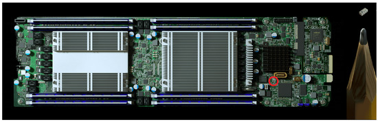 The Super Micro Computer, Inc. servo motherboard featured in Bloomberg Buisinessweek’s article, “The Big Hack.” Among the hundreds of components on the board, the suspected hardware trojan (circled in red) is no larger than a pencil tip, yet it compromised over 30 U.S. companies [10].