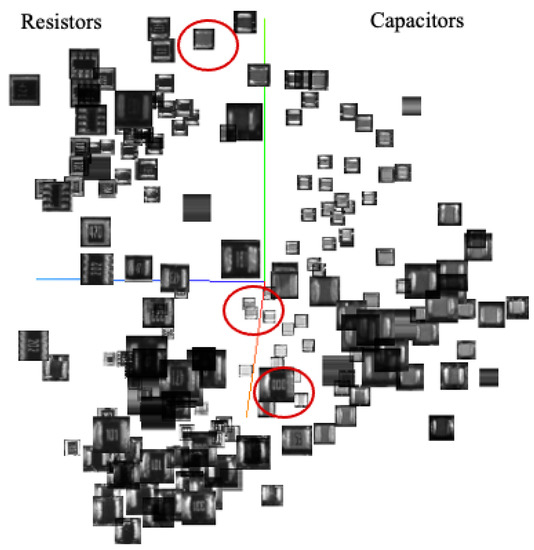 In addition to evaluating the training and testing accuracy for the classification experiments, a 3D t-SNE visualization of the resistor/capacitor separability is also trained and presented (Figure 6). Samples were collected to represent a wide variety of the possible resistors and capacitors. Though most instances were identified correctly, there were a few failed cases, which will be discussed later in Section 5.3.