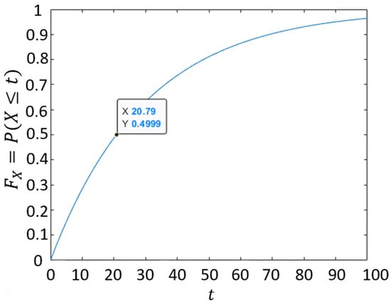 The cumulative distribution function of an exponential distribution with a mean ( = 30. is the probability that a random number is less than or equal to . By plugging , we can see that the median is 20.79, which is where the probability is approximately 50%.