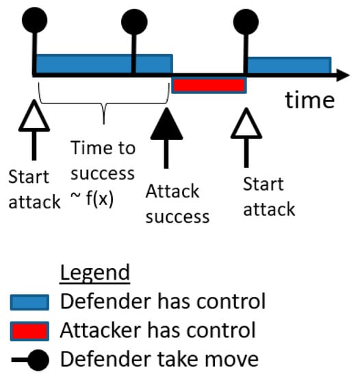 Consider a single PLADD game. Figure 4 shows that a resource is initially controlled by the defender as shown in blue. The attack starts at the very beginning (immediately after the first “take” move at time zero). The time to successful attack is modeled by f(x), which is an exponential distribution function with a mean, i.e., rate parameter. After some time, the attack is successful, so the resource is controlled by the attacker as shown in red. The attacker retains control of the resource until the defender executes a “take” move (e.g., password reset) to regain control of the resource. Note that the defender′s “take” move does not affect an on-going attack from the attacker. Therefore, if the defender executes a “take” move while the attacker′s attack is on-going, the attacker′s ongoing attack is not impaired by the defender′s “take” move.
