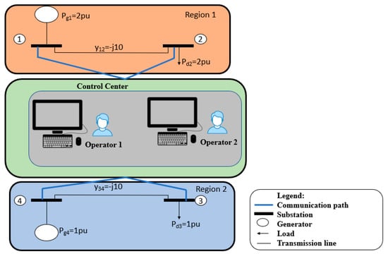 Power grid topology where the control center communicates substations in two different regions.