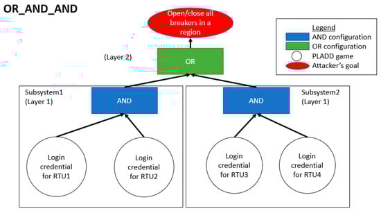 From the attacker’s point of view with regard to Figure 7, the attacker needs to control either (i) both RTU 1 and RTU 2 or (ii) both RTU 3 and RTU 4 to have the ability to open/close all breakers in a region. We define a parallel PLADD system involving at least two layers as a hierarchical parallel PLADD system. Figure 8 and Figure 9 show parallel PLADD systems involving two layers of AND and OR configurations within a single overall parallel PLADD system.