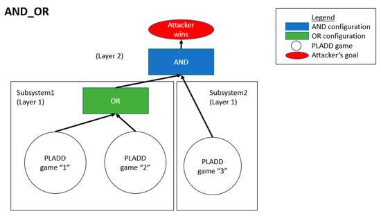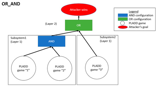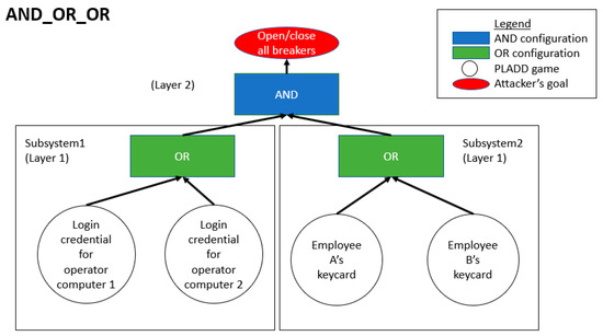 Attack scenario involving two subsystems in the OR configuration while the two subsystems have an AND configuration relationship. This configuration is labeled as AND_OR_OR.