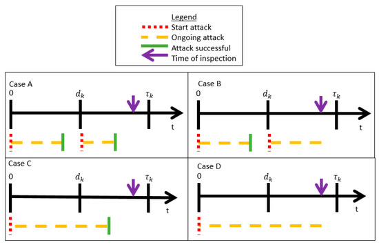 One possible outcome is Case A in Figure 10, where the attacker′s first attack (which occurred at ) is successful before time and the attacker′s second attack is also successful before the time of inspection at time , . The second possible outcome is Case B in Figure 10, where the attacker′s first attack is successful before time and the attacker′s second attack is ongoing (not successful) before the time of inspection at time , . The third possible outcome is Case C in Figure 10, where the attacker′s first attack is successful after time and before the time of inspection at time , . Finally, the last possible outcome is Case D in Figure 10, where the attacker′s first attack is not successful before time and is also not successful before the time of inspection at time . Since we are only interested in calculating the probability that the attacker controls the PLADD game at time , we can disregard the cases where the attacker is not successful (attack is ongoing) at the time of inspection, which are Case B and Case D.