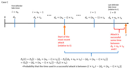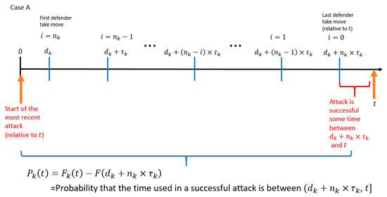 In Case A of Figure 10, the attacker′s last attack started right after the defender′s “take” move at . In this case, the probability that the attacker controls the PLADD game is , which is the probability that the attacker controls the PLADD game at multiplied by the probability that the time used in a successful attack is less than or equal to (recall that is the time since the last defender “take” move, see Table 1). In Case C of Figure 10, the attacker′s last attack started at . In this case, the probability that the attacker controls the PLADD game is , which is the probability that the time used in a successful attack is . Note that Case A accounts for the probability that the attacker controls the PLADD game when the attacker′s most recent attack (relative to ) is right after , and Case C accounts for the probability that the attacker controls the PLADD game when the attacker′s most recent attack began at . By adding the probability that the attacker controls the PLADD game at time in Cases A and C, the probability that the attacker controls the PLADD game with index at time , is given by Equation (2).