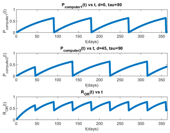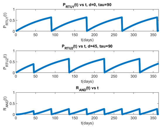 The defender needs to decide how to schedule password resets on RTU 1, RTU 2, Operator Computer 1, and Operator Computer 2. Based on Theorem 6, assuming the password reset period for RTU 1 is equal to the password reset period for RTU 2, the defender should not reset passwords for RTU 1 and RTU 2 simultaneously. The time between the password reset of RTU 1 and the password reset of RTU 2 should equal half of the password reset period. Based on Theorem 7, assuming the password reset period for Operator Computer 1 and the password reset period for Operator Computer 2 are equal, the defender should reset passwords for Operator Computer 1 and Operator Computer 2 simultaneously. We have simulated our example attack scenarios for 365 days. The simulation uses Equations (40) and (41) to calculate the attacker′s probability of a successful attack on the parallel PLADD system with respect to time. Then, we use Equations (42) and (43) to calculate the attacker′s EPS for a parallel PLADD system in the AND configuration and the attacker′s EPS for a parallel PLADD system in the OR configuration. We fixed dRTU1 and dcomputer1 to zero and varied dRTU2 and dcomputer2, as shown in Table 6.