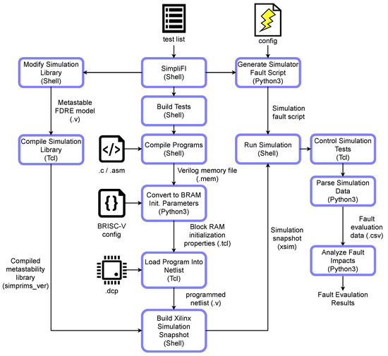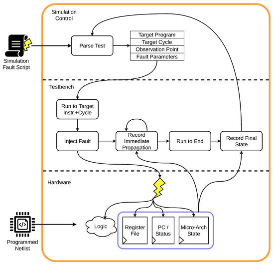 - Support Software-Level Analysis—The final results should be tailored towards evaluating software-level behavior. Therefore, SimpliFI implementations must be able to collect software-relevant state at the end of a test, including processor registers, the program counter, and the final processor hardware state. These results should contain at least as much information as what can be collected with physical device testing [11,12]. In conjunction with design principle 2 the software-level data collected by SimpliFI gives users more information than what is possible with physical fault testing methods, where the microarchitectural state is inaccessible.