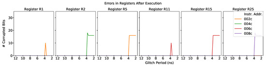 - Proy, J.; Heydemann, K.; Berzati, A.; Majéric, F.; Cohen, A. A First ISA-Level Characterization of EM Pulse Effects on Superscalar Microarchitectures: A Secure Software Perspective. In Proceedings of the 14th International Conference on Availability, Reliability and Security, Canterbury, UK, 26–29 August 2019; Association for Computing Machinery: New York, NY, USA, 2019. [Google Scholar] [CrossRef]