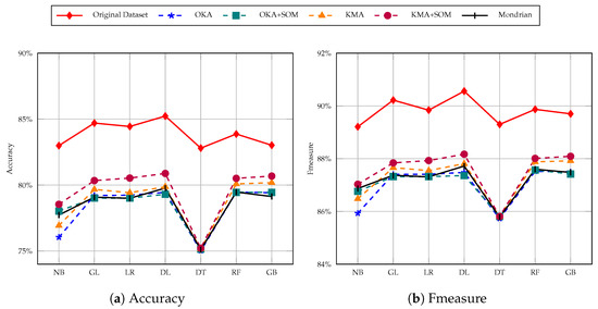 In Figure 7 we considered 5 members in a cluster. After applying the naive Bayes classification model, we observed that accuracy of the KMA+SOM version of the Adult dataset provides around 80% accuracy whereas on the original dataset it was around 83%. The OKA+SOM dataset accuracy is bit lower than that of KMA+SOM. Even on the original dataset, the lowest accuracy was given by the decision tree method, and the same applies to our versions. The highest accuracy achieved is around 82% using a deep learning classification model, whereas on the original dataset it is around 85%. The same trend is observed for fmeasure and precision as well.